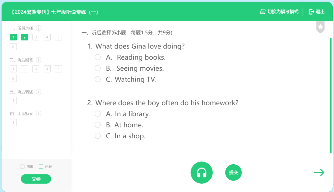 支持听后回答、看图说话等100+种听力口语题型针对性训练
